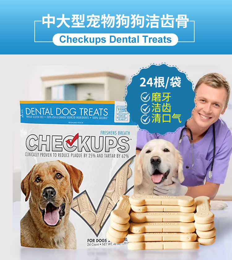 美国进口CheckUps洁齿骨宠物狗磨牙棒大型犬洁牙齿骨头形零食试吃