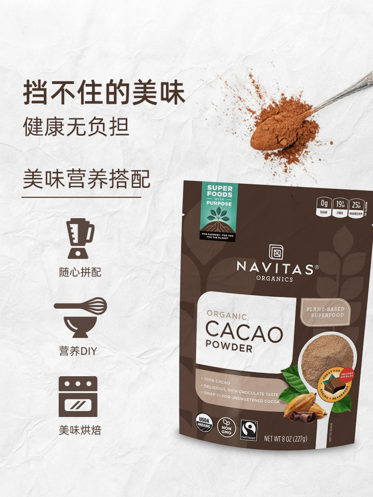 Navitas未碱化生可可粉907g无添加糖帕梅拉隔夜燕麦生酮冲饮